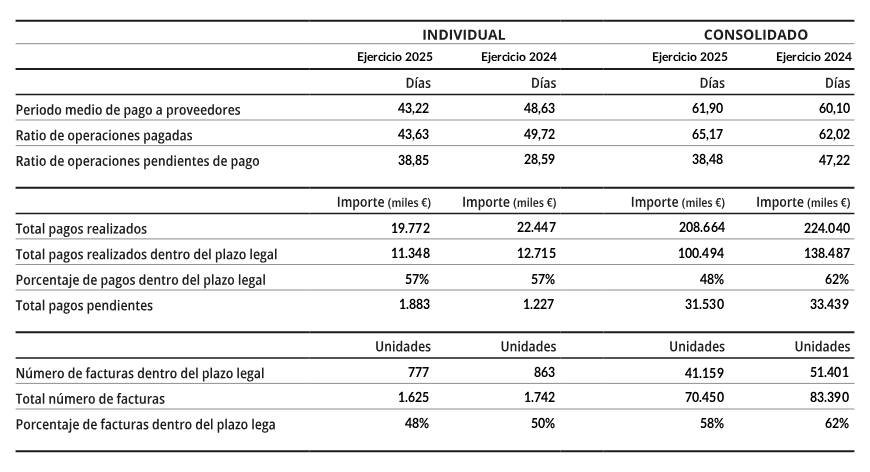 El periodo medio de pago a proveedores de Vocento, S.A. y grupo consolidado, calculado de acuerdo con los criterios establecidos en la disposición adicional única de la Resolución de 29 de enero de 2016 del Instituto de Contabilidad y Auditoría de Cuentas, se expresa en la siguiente tabla: